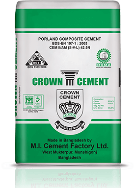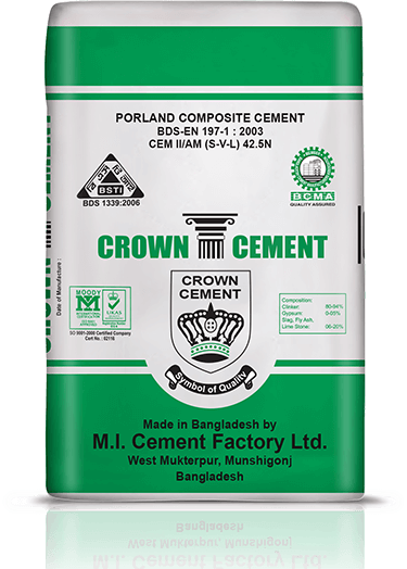 Crown Portland composite cement is CEM-II/A-M is a cement consisting of Fly ash (PFA), slag and limestone designated by the specification of BDS EN 197-1: 2003; CEM -II/A-M (V-S-L), 42.5 N. PCC is the most suitable cement for construction in Bangladesh. CEM – II /A-M contains 80-94% Clinker, which is substantially higher than CEM – II/B-M containing 65 – 79% Clinker that will give us extra advantage in strength development and increase concrete performance.
